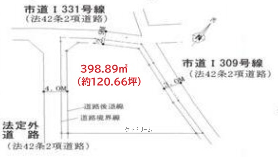 | 接道 | 北 1.9m(幅員) 公道 14m(接面) 東 2m(幅員) 公道 22m(接面) 西 3m(幅員) 公道 20m(接面) |